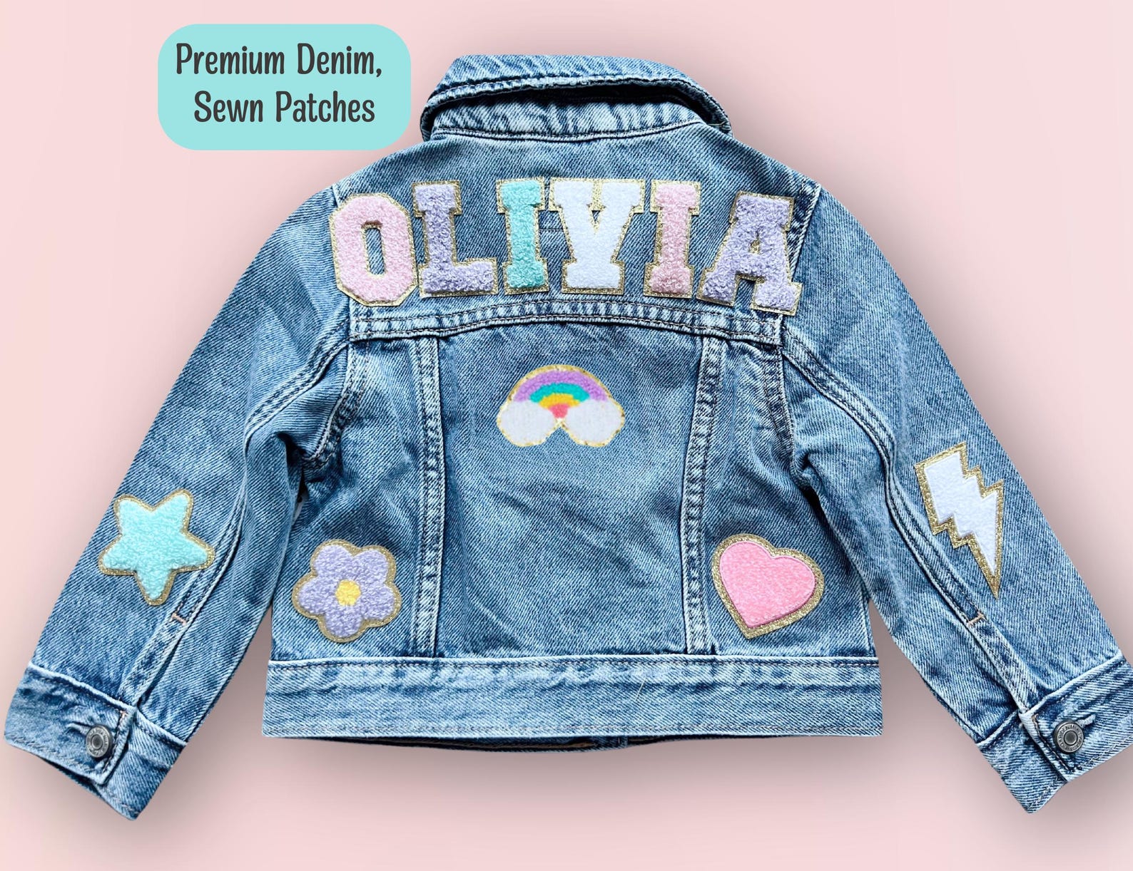 Make your little one’s outfit extra special with this adorable personalized denim jacket! Designed for toddlers and kids, this custom jean jacket features soft chenille letters for their name and fun embroidered patches, adding a playful and stylish touch.